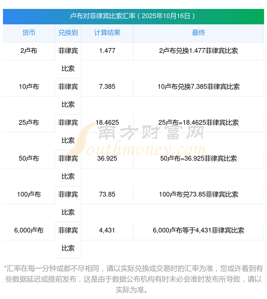 南方財(cái)富網(wǎng)為您提供盧布對(duì)菲律賓比索匯率最新價(jià)格詳情。