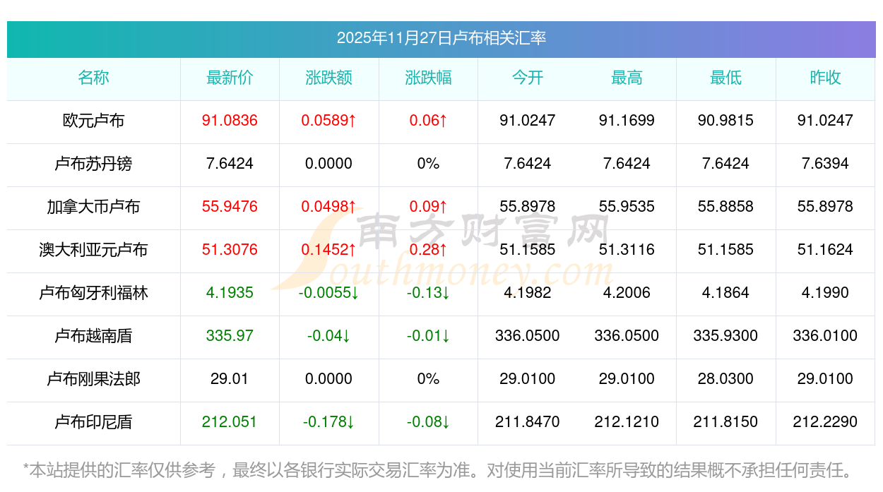 根據(jù)2025年11月27日匯率,盧布兌換埃鎊匯率最新價(jià)0.607900,今開(kāi)價(jià)0.6079,昨收價(jià)0.6079,最高價(jià)0.6079,最低價(jià)0.6079。
