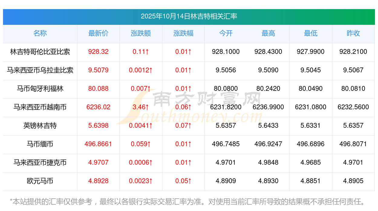 2025年10月14日林吉特相關匯率查詢