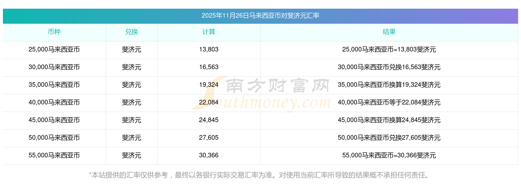 馬來西亞幣換斐濟元 今日匯率(2025年11月26日)