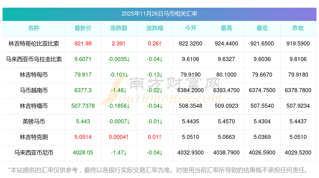 根據(jù)2025年11月26日匯率,馬幣兌換波幣匯率最新價(jià)0.884400,今開價(jià)0.8827,昨收價(jià)0.8826,最高價(jià)0.8856,最低價(jià)0.8805。