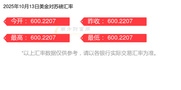 2025年10月13日,匯率換算:1美金=600.2207蘇磅。如:1美金、2美金、5美金、10美金、20美金、50美金、100美金,分別折合蘇磅600.2207、1200.4414、3001.1035、6002.207、12004.414、30011.035、60022.07蘇磅。
