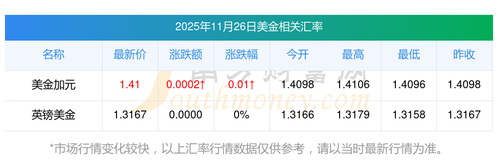 根據(jù)2025年11月26日匯率計(jì)算,USD兌換CAD匯率最新價(jià)1.410000: