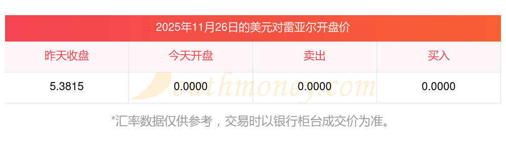 2025年11月26日美元兌換雷亞爾匯率是:5.3815