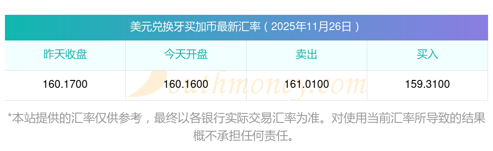 今日牙買加幣匯率行情:美元兌換牙買加元匯率一覽表(2025-11-26)