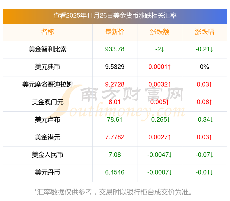根據(jù)2025年11月26日匯率,美金兌換牙買加元匯率最新價160.160000,今開價160.1600,昨收價160.1700,最高價160.5000,最低價160.0000。
