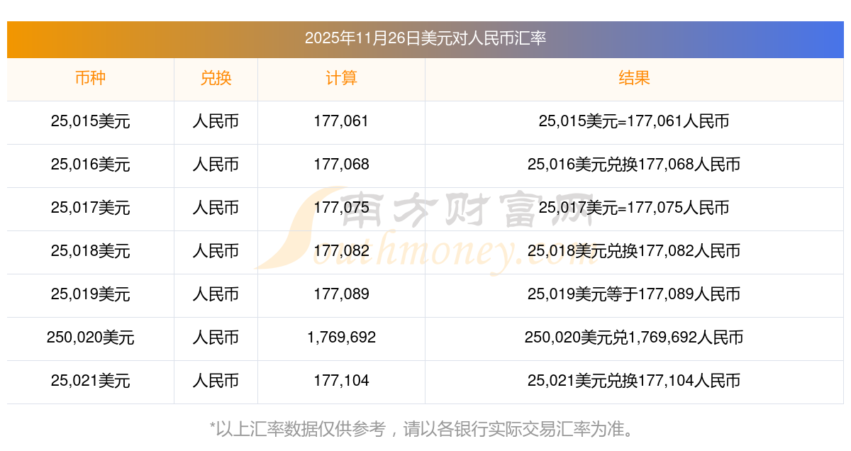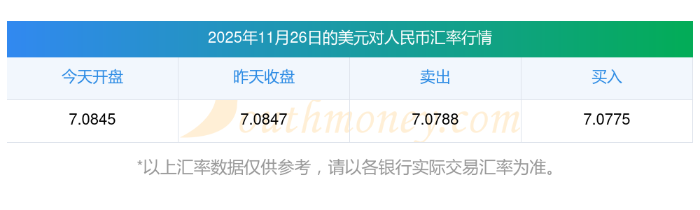 今日匯價(jià)2025年11月26日:3美元兌人民幣匯價(jià)表