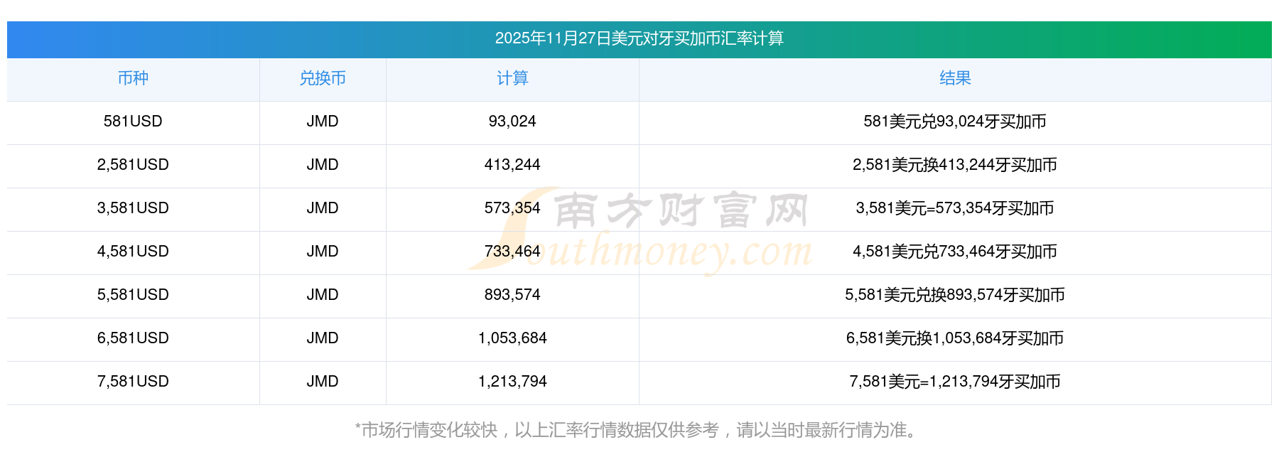 2025年11月27日美元與牙買加幣的兌換匯率計算如下:
