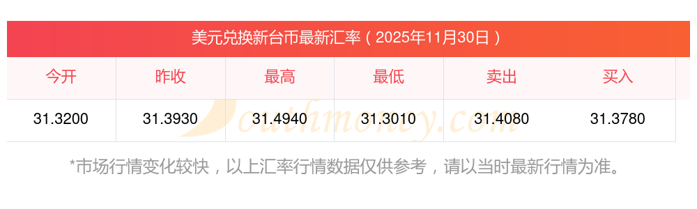 今天匯率行情:1美元兌新臺(tái)幣匯率表(11月30日)