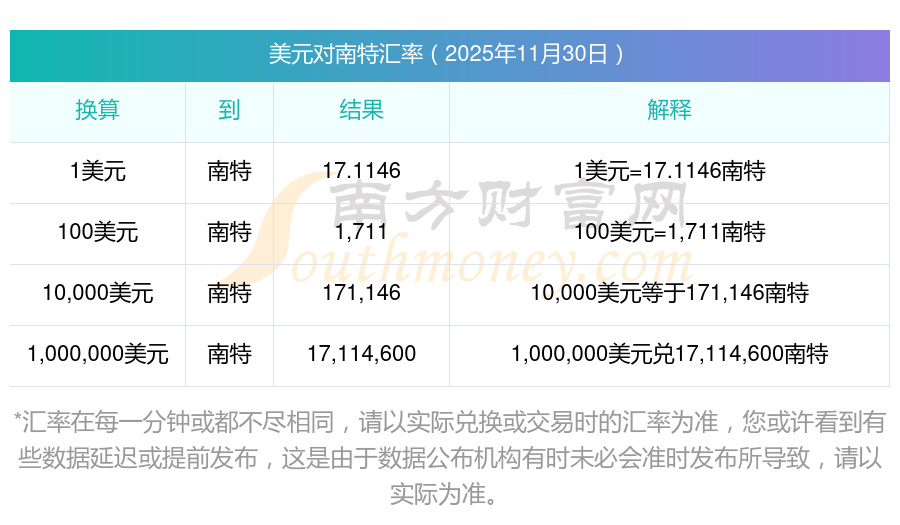 今日1001美元對南特匯率多少?匯率計(jì)算方法2025年11月30日
