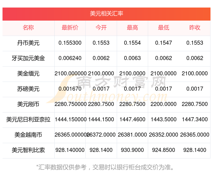 匯率數(shù)據(jù)僅供參考,交易時(shí)以銀行柜臺(tái)成交價(jià)為準(zhǔn)。
