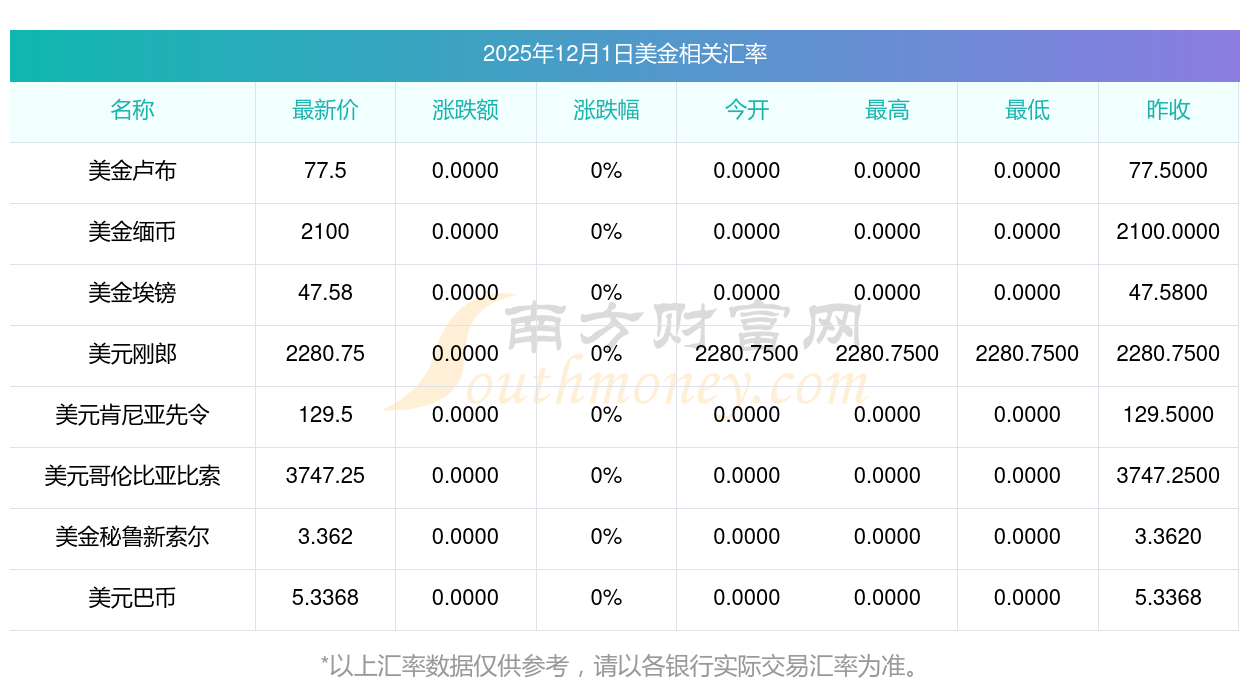 根據(jù)今天2025年12月1日匯率計算,USD兌換RUB匯率最新價77.500000,今開價0.0000,昨收價77.5000,最高價0.0000,最低價0.0000。