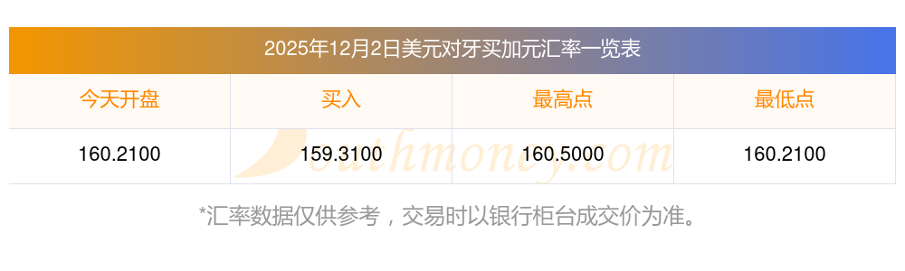 2025年12月2日美元換牙買加元的匯率為:160.21