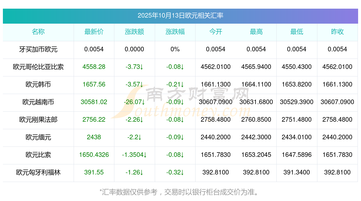 根據(jù)2025年10月13日匯率計算,EUR兌換FJD匯率最新價2.636000,今開價2.6471,昨收價2.6471,最高價2.6714,最低價2.6354。
