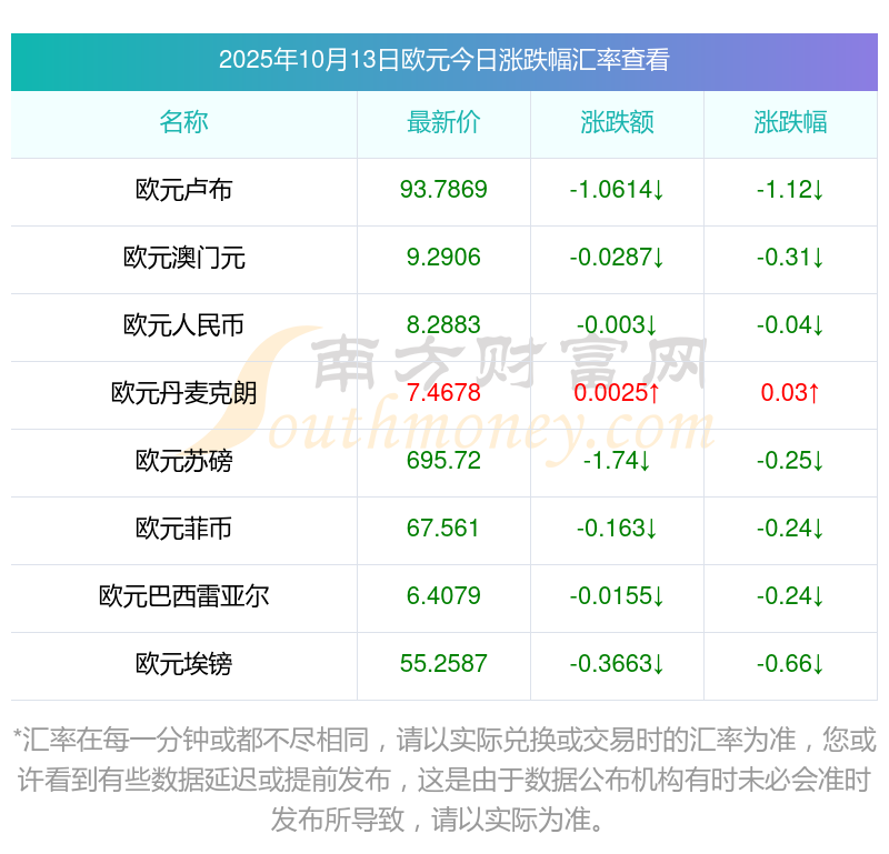 2025年10月13日最新消息,歐元兌換菲幣最新匯率為67.561000,今開為67.7240,昨收為67.7240,最高為67.7560,最低為67.4310。
