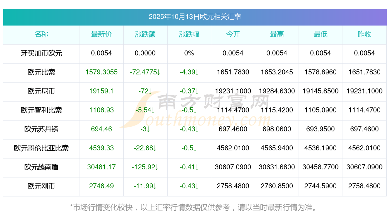 根據(jù)2025年10月13日匯率計(jì)算,歐元兌換典幣匯率最新價(jià)10.991900,今開(kāi)價(jià)11.0454,昨收價(jià)11.0509,最高價(jià)11.0580,最低價(jià)10.9862。