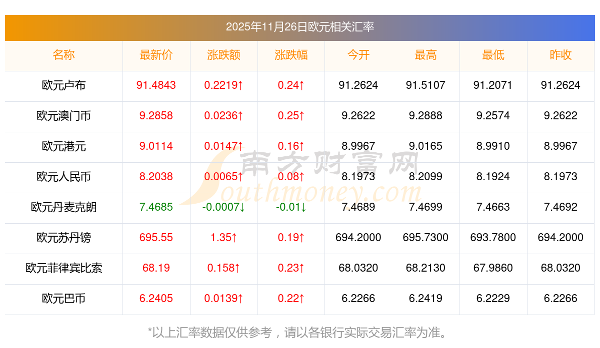 根據(jù)2025年11月26日匯率,歐元兌換牙買加幣匯率最新價(jià)185.649500,今開(kāi)價(jià)185.3249,昨收價(jià)185.3249,最高價(jià)185.9717,最低價(jià)185.2011。