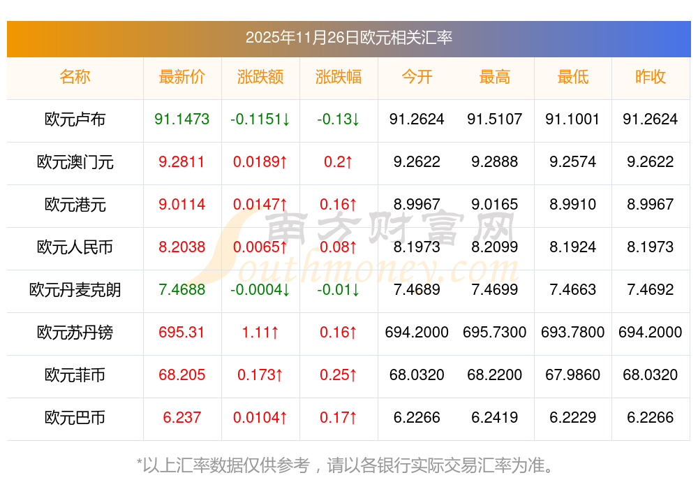 根據(jù)2025年11月26日匯率,歐元兌換比索匯率最新價(jià)1675.770800,今開價(jià)1674.8300,昨收價(jià)1674.8300,最高價(jià)1678.5211,最低價(jià)1673.8166。