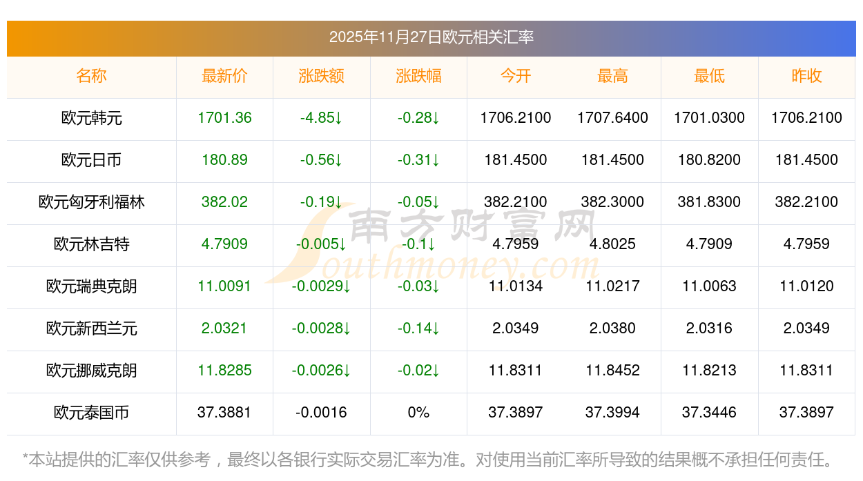 根據(jù)2025年11月27日匯率,歐元兌換日幣匯率最新價(jià)180.890000,今開(kāi)價(jià)181.4500,昨收價(jià)181.4500,最高價(jià)181.4500,最低價(jià)180.8200。
