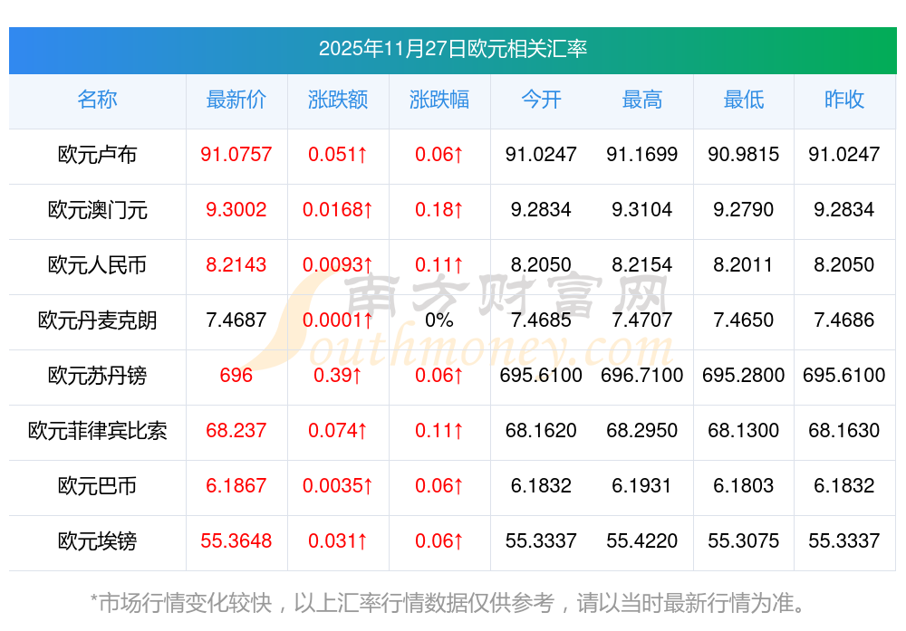 根據(jù)今天2025年11月27日匯率計(jì)算,EUR兌換CHF匯率最新價(jià)0.932400,今開價(jià)0.9326,昨收價(jià)0.9327,最高價(jià)0.9332,最低價(jià)0.9318。