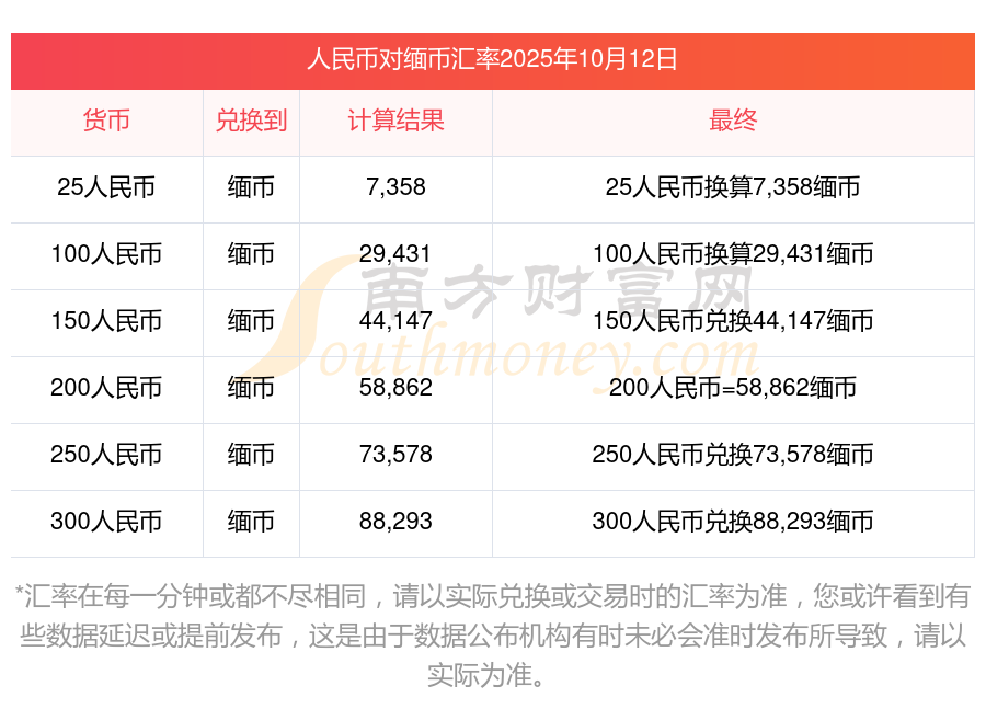 2025年10月12日人民幣與緬幣的兌換匯率計算如下: