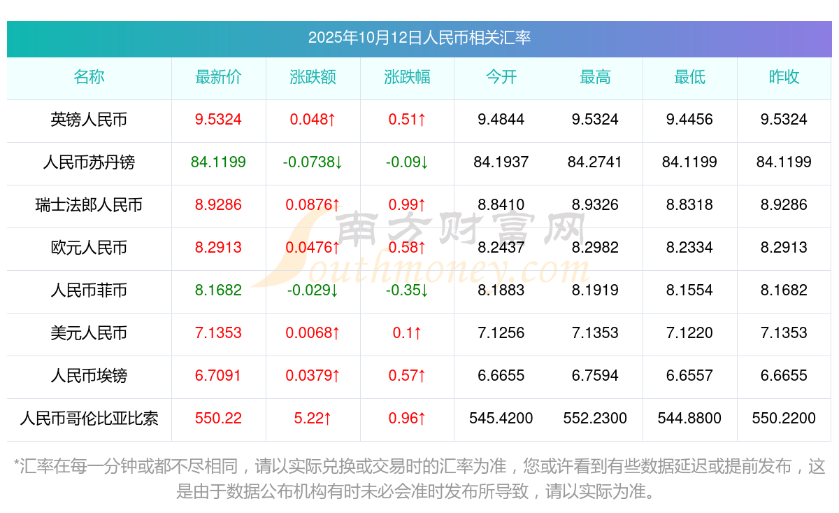 2025年10月12日人民幣兌換加幣最新匯率:0.196300,今開:0.1967,昨收:0.1963,最高:0.1971,最低:0.1961。