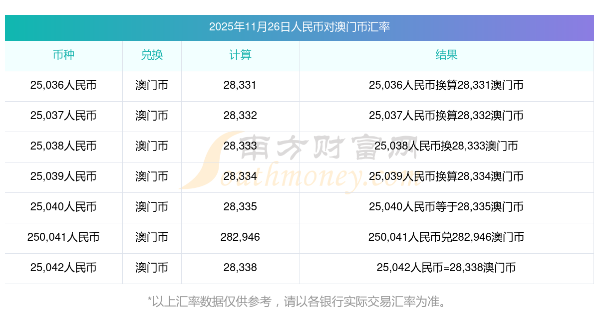 今天人民幣兌換澳門幣匯率查詢(2025年11月26日)