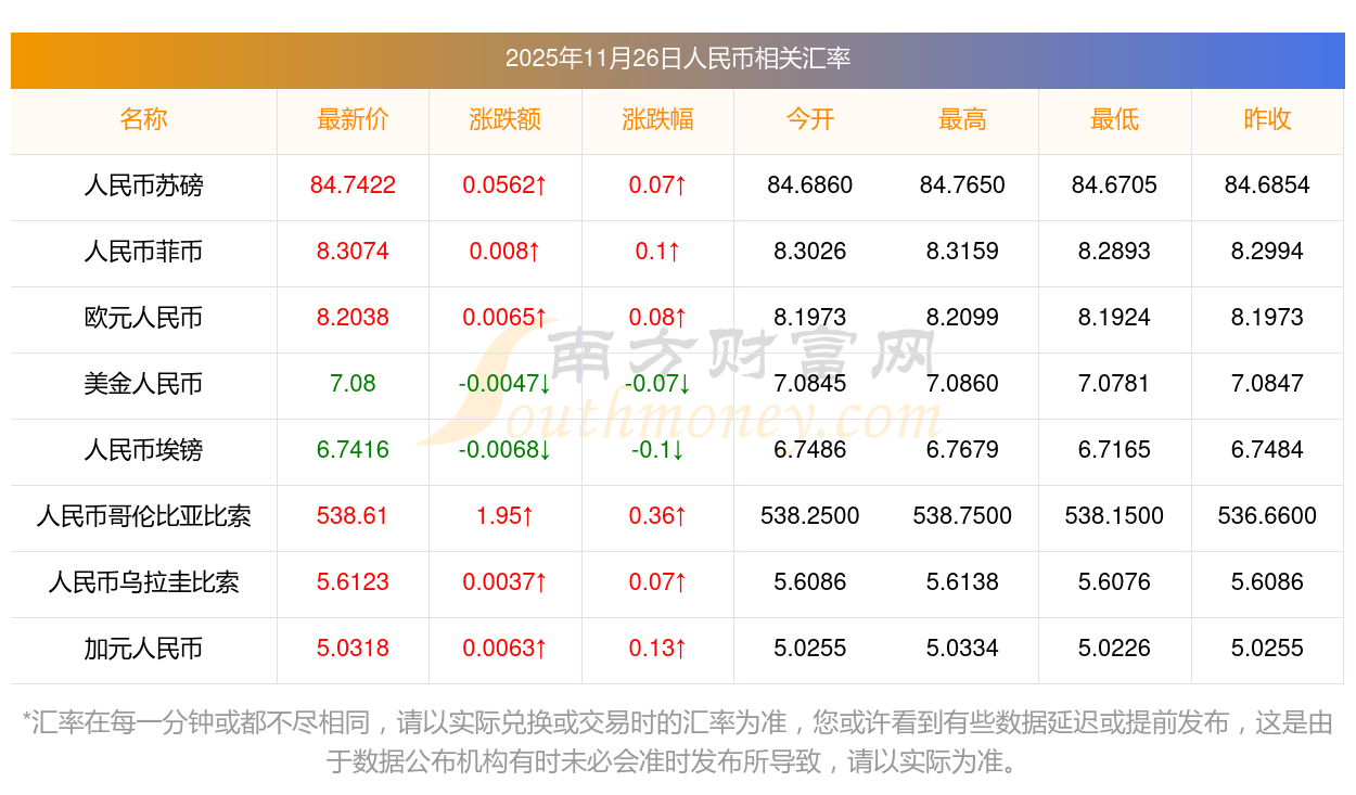 匯率在每一分鐘或都不盡相同,請以實際兌換或交易時的匯率為準,您或許看到有些數據延遲或提前發(fā)布,這是由于數據公布機構有時未必會準時發(fā)布所導致,請以實際為準。