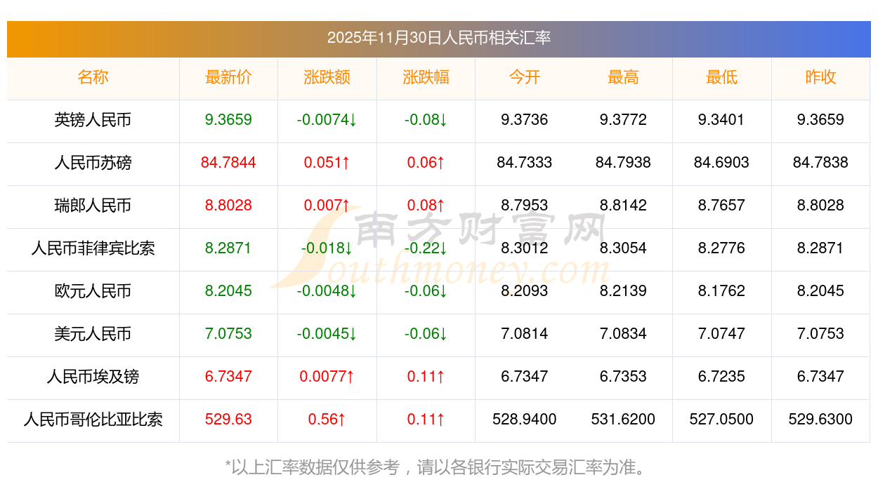 2025年11月30日人民幣相關(guān)匯率查詢