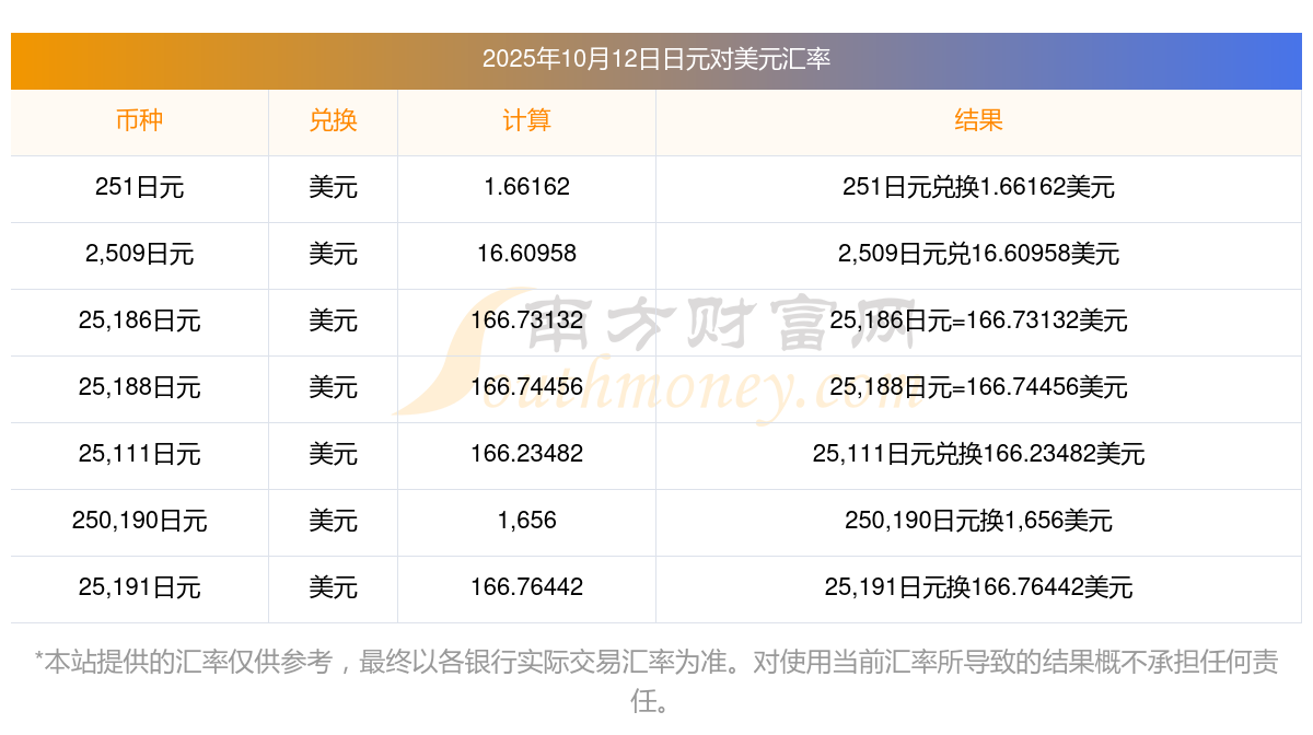 2025年10月12日日元與美元的兌換匯率計算如下: