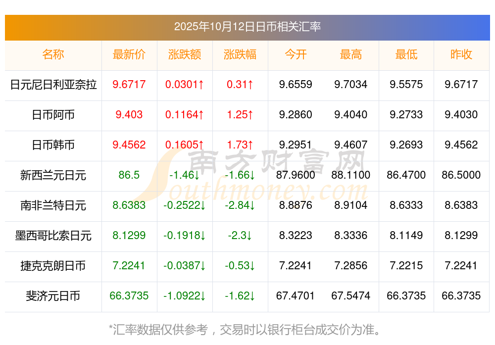 根據(jù)2025年10月12日匯率計(jì)算,JPY兌換EUR匯率最新價(jià)0.005693:今開(kāi)價(jià)0.0056,昨收價(jià)0.0057,最高價(jià)0.0057,最低價(jià)0.0056。