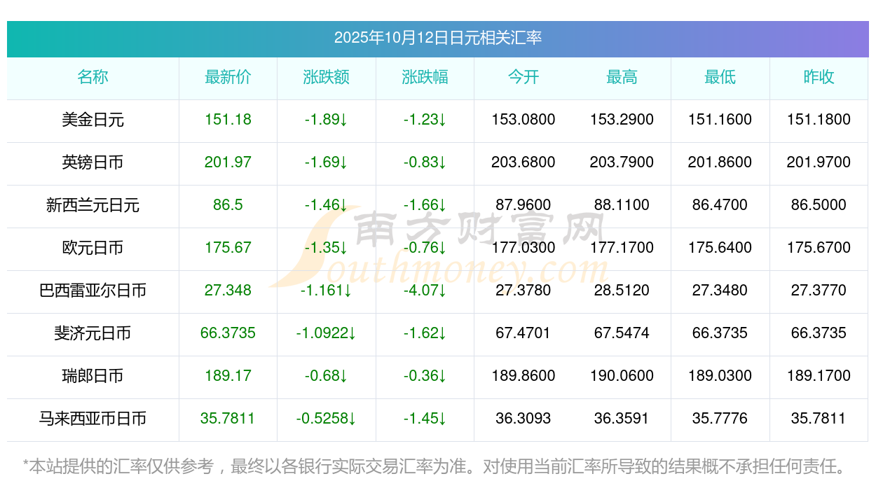 2025年10月12日日元相關(guān)匯率查詢