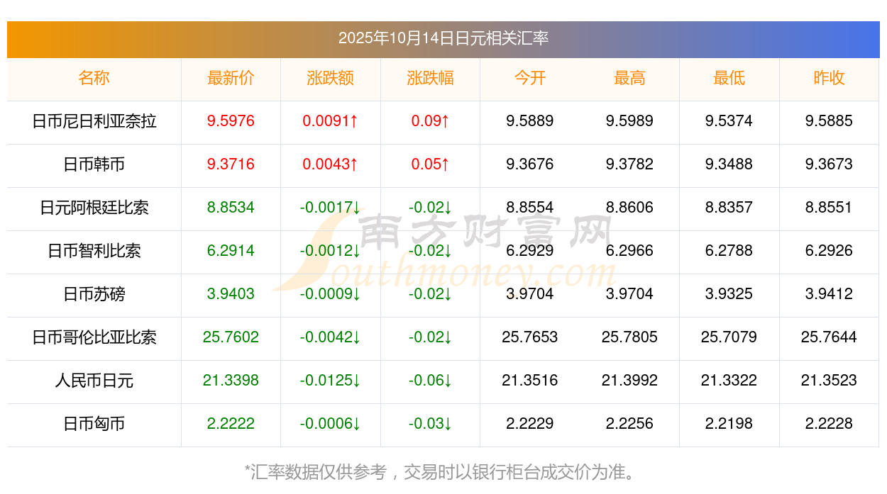 2025年10月14日最新消息,日元兌換典幣最新匯率為0.062567,今開為0.0624,昨收為0.0624,最高為0.0626,最低為0.0623。