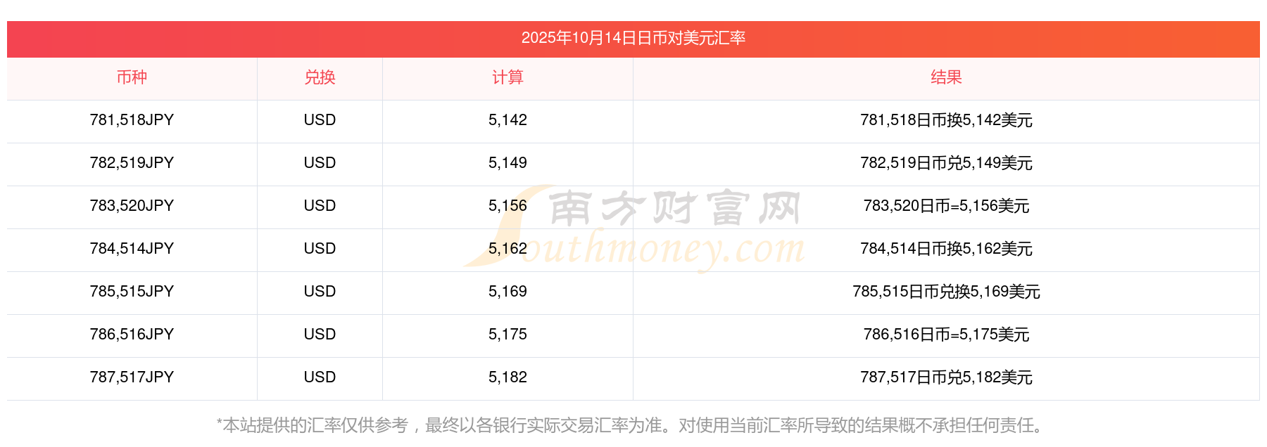 2025年10月14日今天匯率,換算日幣(JPY)到美元(USD):