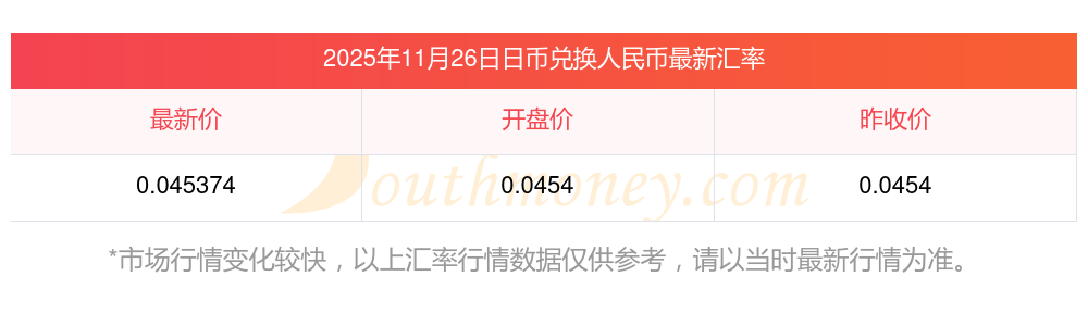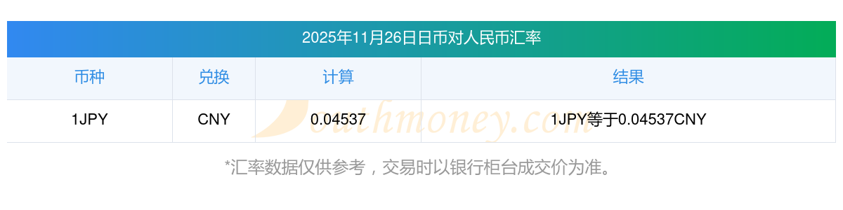 2025年11月26日日幣匯價:6日幣兌人民幣匯價表