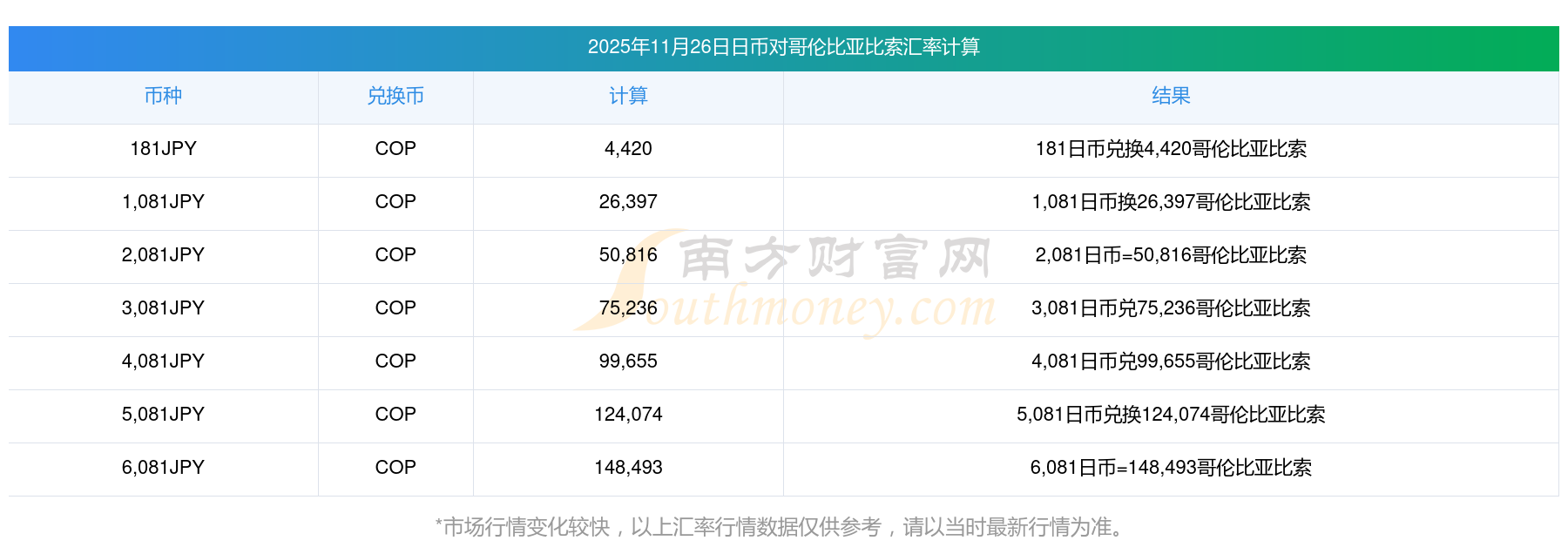 南方財(cái)富網(wǎng)為您提供日幣兌換哥倫比亞比索匯率最新價(jià)格詳情。