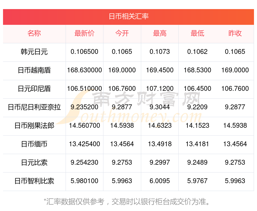 根據(jù)2025年11月26日匯率,日幣兌換紅比索匯率最新價(jià)0.153300,今開價(jià)0.1538,昨收價(jià)0.1538,最高價(jià)0.1542,最低價(jià)0.1533。