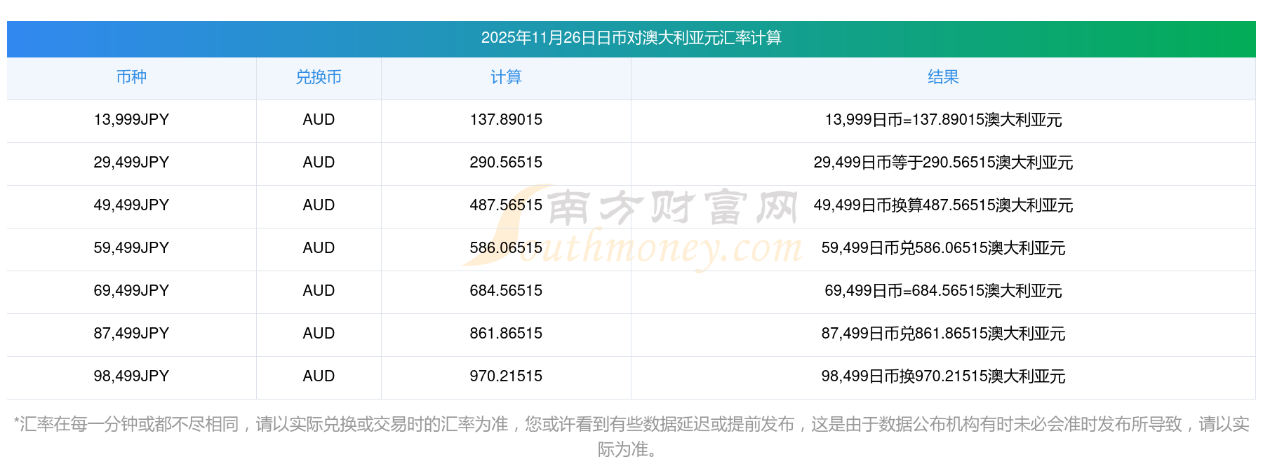 今日日幣匯率多少?日幣轉(zhuǎn)換澳大利亞元匯率計(jì)算表? 2025-11-26