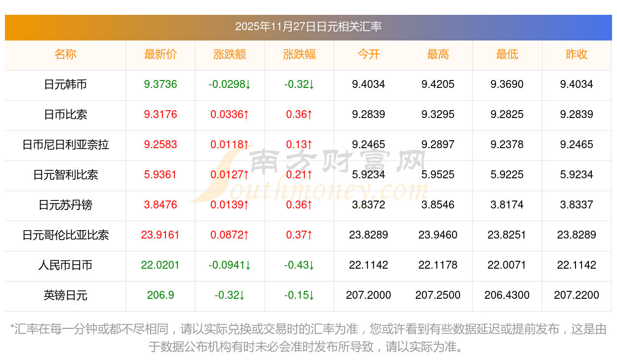 2025年11月27日最新消息,日元兌換泰國幣最新匯率為0.206650,今開為0.2061,昨收為0.2061,最高為0.2069,最低為0.2060。