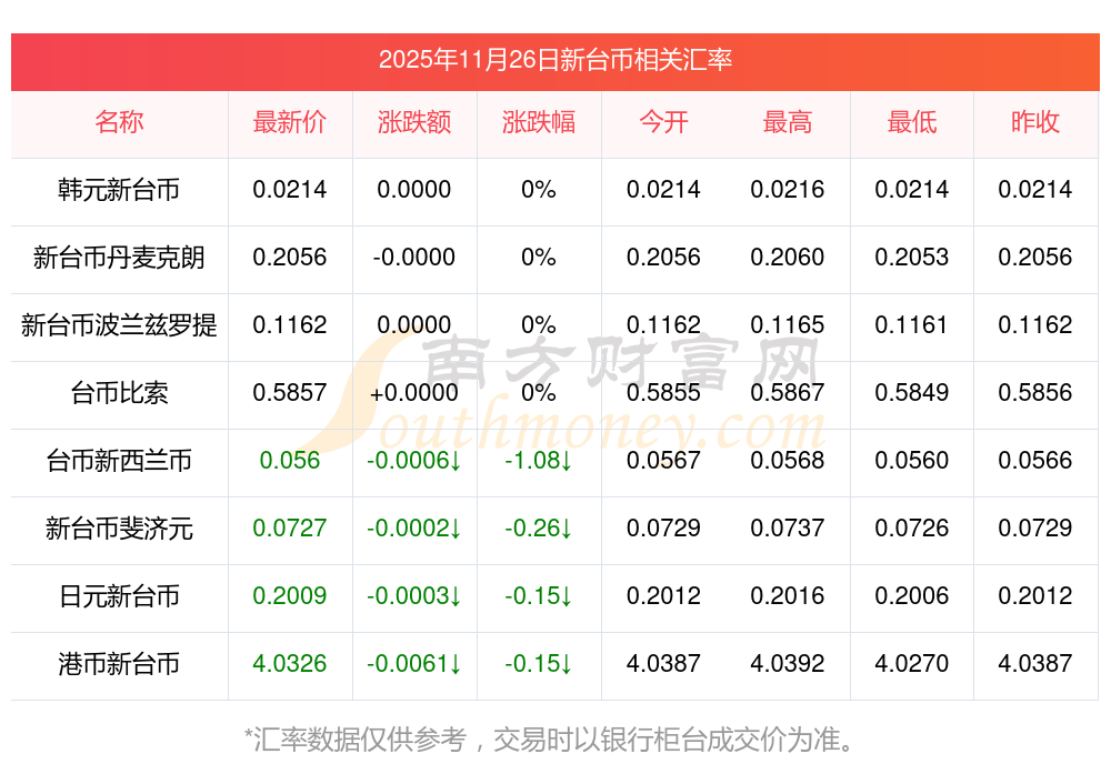 2025年11月26日新臺(tái)幣相關(guān)匯率查詢(xún)