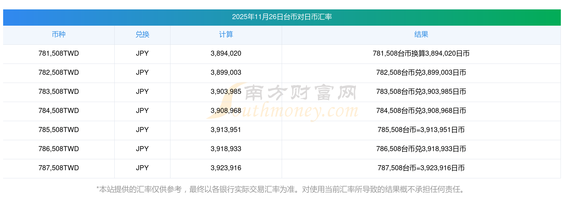 臺(tái)幣500元換日元多少?今日臺(tái)幣匯率一覽2025/11/26