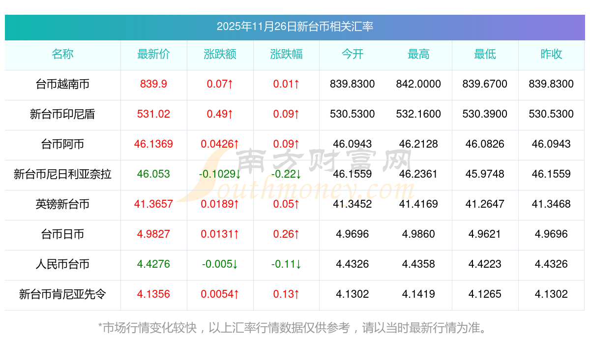 2025年11月26日新臺(tái)幣相關(guān)匯率查詢
