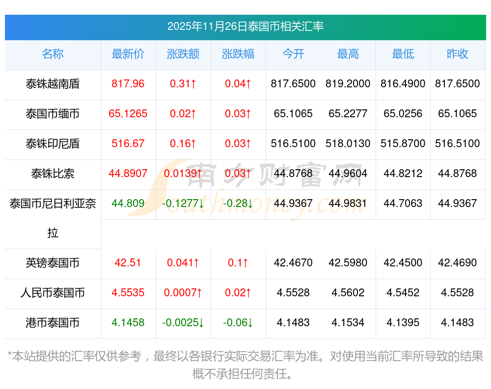 2025年11月26日泰國幣相關(guān)匯率查詢