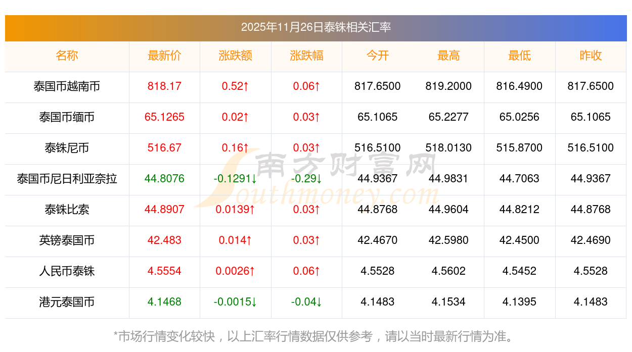根據(jù)2025年11月26日匯率,泰銖兌換澳門幣匯率最新價0.248400,今開價0.2482,昨收價0.2482,最高價0.2489,最低價0.2479。