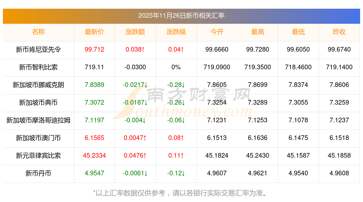 根據(jù)2025年11月26日匯率,新幣兌換捷克克朗匯率最新價(jià)16.021400,今開價(jià)16.0472,昨收價(jià)16.0484,最高價(jià)16.0590,最低價(jià)16.0171。