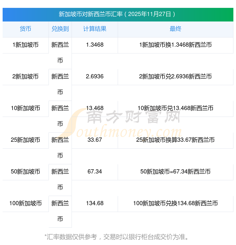 根據(jù)今日匯率:1新加坡幣、2新加坡幣、5新加坡幣、10新加坡幣、20新加坡幣、50新加坡幣、100新加坡幣,分別折合新西蘭幣1.3468、2.6936、6.734、13.468、26.936、67.34、134.68新西蘭幣。