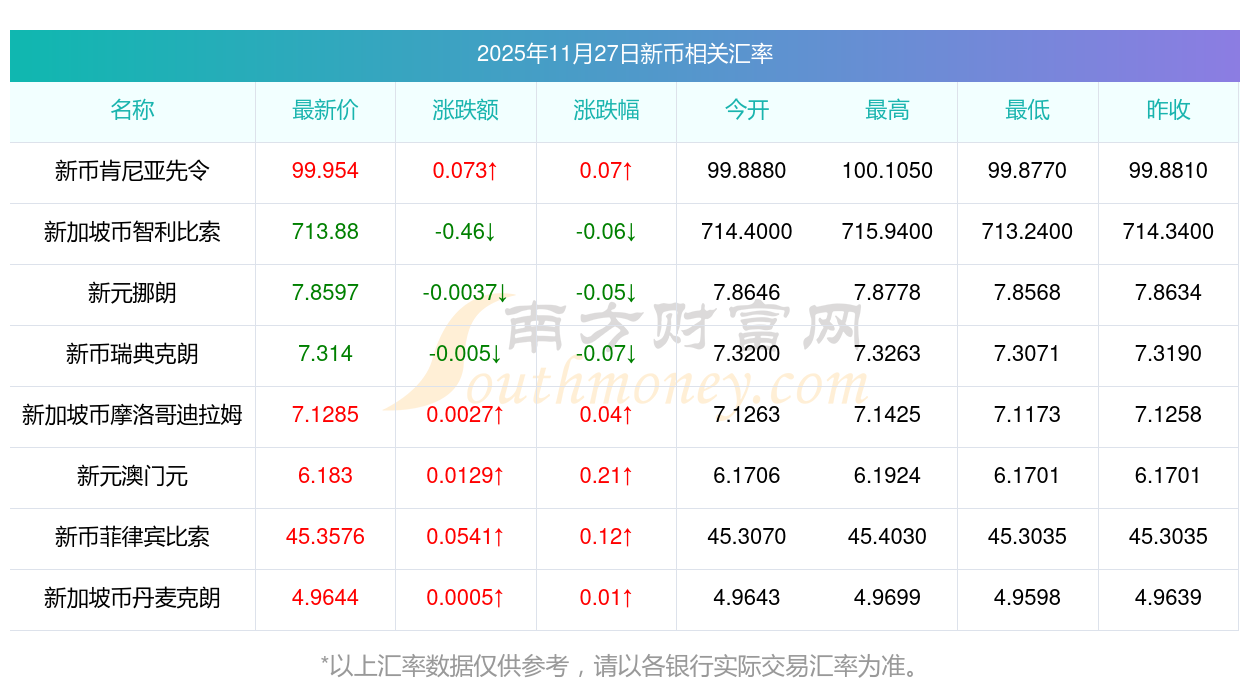 根據(jù)2025年11月27日匯率計算,新幣兌換肯尼亞先令匯率最新價99.954000,今開價99.8880,昨收價99.8810,最高價100.1050,最低價99.8770。