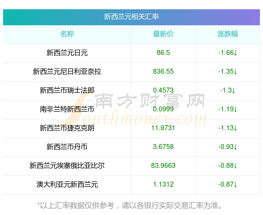 南方財(cái)富網(wǎng)為您提供新西蘭元對(duì)澳大利亞元匯率最新價(jià)格詳情。