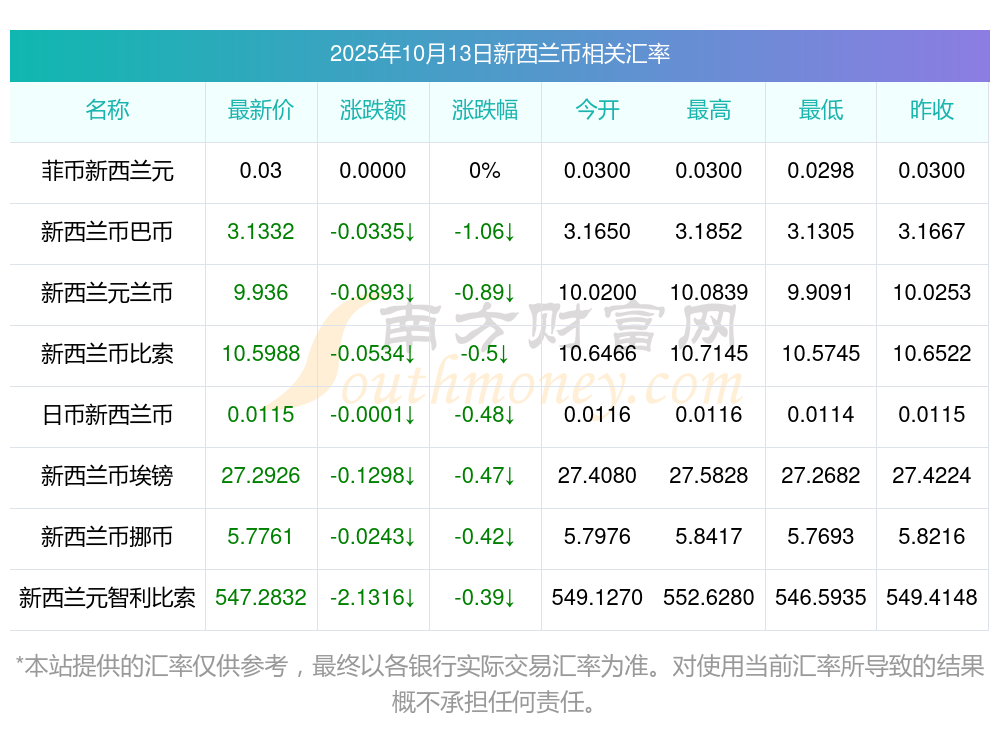 2025年10月13日新西蘭幣相關(guān)匯率查詢