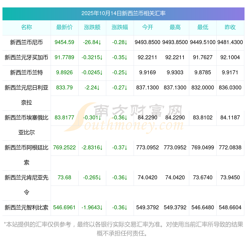 2025年10月14日新西蘭幣相關(guān)匯率查詢